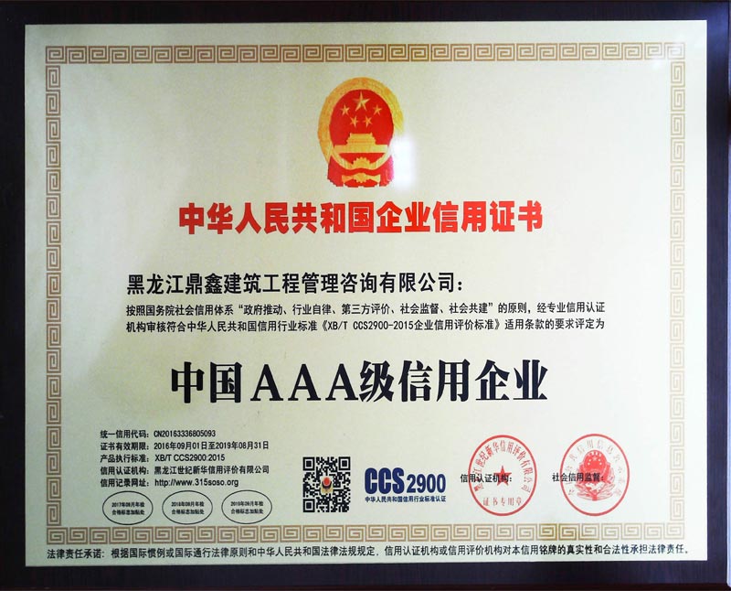 中國(guó)AAA級(jí)信用企業(yè)證書